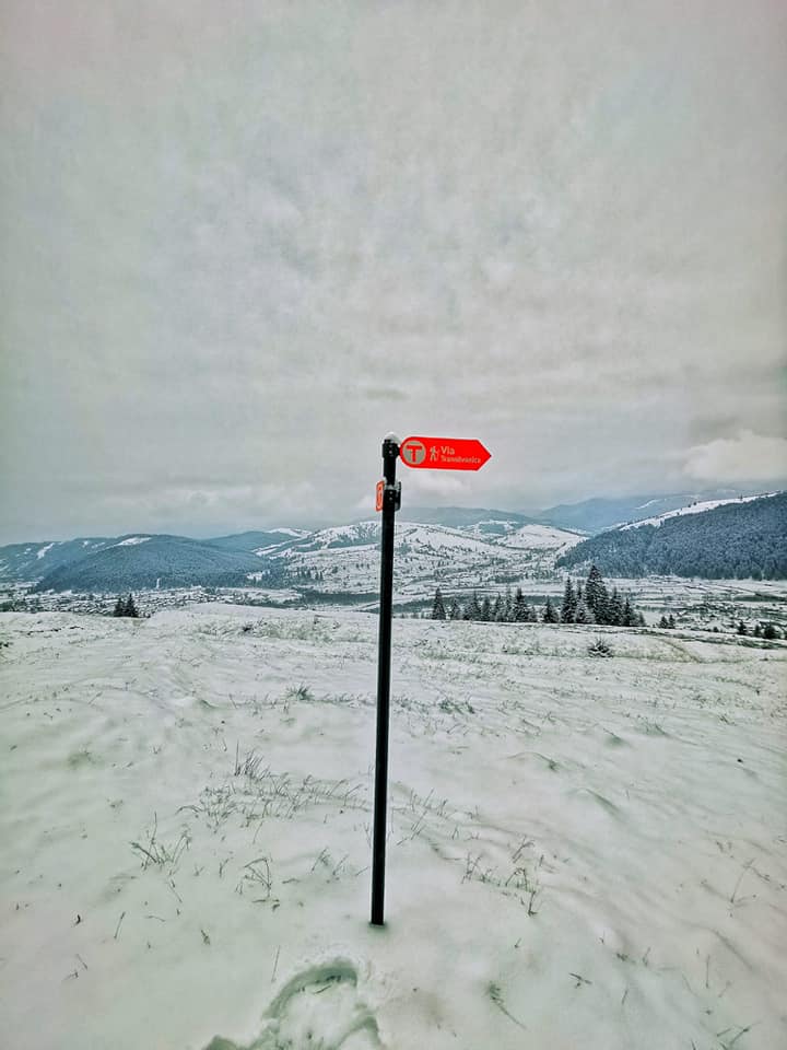 Și a venit vremea coborâtului!Și ce trânte… Și ce icnituri, că am uitat pe loc de panorame și eroi și ViaTransilvanica! Și Doamne, și la propriu și la figurat, greu îi de coborât! Și de-a coasta și mai de-a dreptul, a rânduit Dumnezeu să mă vad iar în Pârâul Lupoii, să le fac câte o poză caselor Florentinei și Eleonorei, care-s departe, în alte țări, că poate le-oi mângâia sufletul o țâră!Și-am ajuns acasă, plină de frumusețe geografică, turistică și patriotism, cu bocancii plini de omăt, o țâră stâlcitâ pe la una dintre părți, dar nu spun nimic, n-am nicio șansă de vreo oarecare crezare!