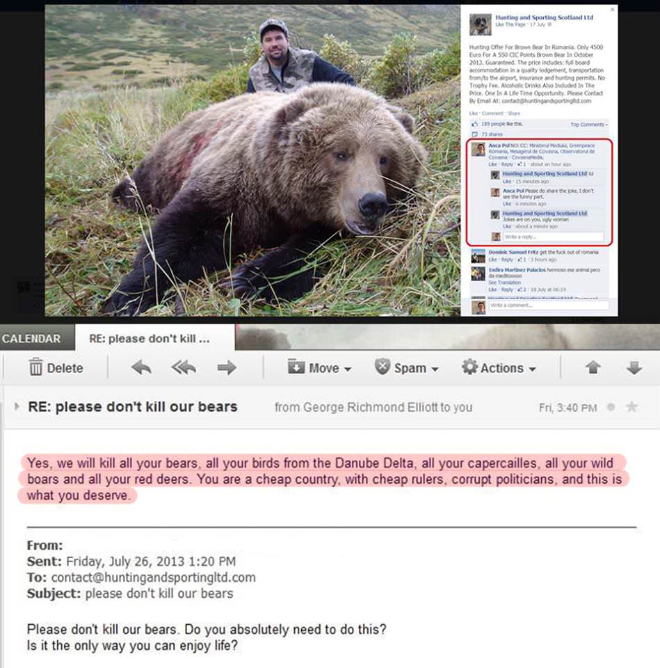 „Da, vom ucide toţi urşii voştri, toate păsările voastre din Delta Dunării, toţi cocoşii de munte, toţi mistreţii şi toţi cerbii. Sunteţi o ţară ieftină, cu conducători ieftini, politicieni corupţi şi asta meritaţi” spunea acum ceva ani (2013 mai exact n.r.) George Richmond Elliott de la Hunting and Sporting Scotland Ltd, companie organizatoare de partide de vânătoare în țara noastră. Cam așa suntem noi văzuți în Europa.Ursul Arthur este doar vârful aisbergului și a ieșit la suprafață pentru că nu s-au înțeles niște băieți între ei, de asta a și apărut povestea atât de târziu, după două luni.În România se braconează după bunul plac al șmecherilor…cu complicitatea statului.