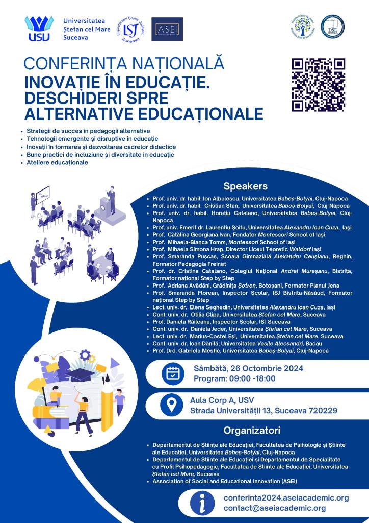 Universitatea „Ștefan cel Mare” din Suceava găzduieşte, pe 26 octombrie 2024, CONFERINȚA NAȚIONALĂ „INOVAȚIE ÎN EDUCAȚIE. DESCHIDERI SPRE ALTERNATIVE EDUCAȚIONALE”. Această manifestare științifică este organizată de către Departamentul de Științe ale Educației și Departamentul de Specialitate cu Profil Psihopedagogic din cadrul Facultății de Științe ale Educației, în colaborare cu Departamentul de Științe ale Educației al Facultății de Psihologie și Științe ale Educației de la Universitatea „Babeș-Bolyai” din Cluj-Napoca, Association of Social and Educational Innovation (A.S.E.I.) și Inspectoratul Școlar Județean Suceava.